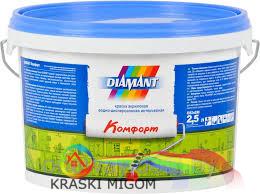 Diamant Комфорт (Диамант Комфорт) – Матовая краска на водно-дисперсионной основе. Имеет высокую степень белизны, высокую укрывистость, хорошие показатели экологичности материала. Создает здоровый микроклимат в помещении. Diamant Комфорт предназначена для окраски стен и потолков, которые не подвергаются особым поверхностным нагрузкам.