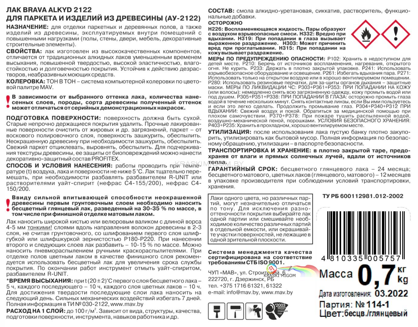 Лак изготовлен из высококачественных компонентов и отличается от традиционных алкидных лаков уменьшенным временем высыхания, повышенной твердостью, высокой эластичностью, стойкостью к истиранию, образованию царапин и трещин, отличной влагостойкостью и долговечностью покрытия. Устойчив к действию неабразивных моющих средств. По степени блеска выпускается в глянцевом и матовом исполнении.