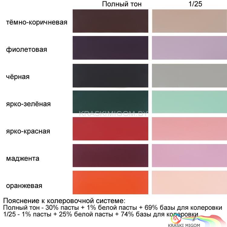 Паста представляет собой однородную вязкую текучую массу. Для получения однородного цвета и исключения разнооттеночности материалов при работе на большой площади окрашиваемой поверхности рекомендуется колеровать требуемое количество материала в полном объеме.