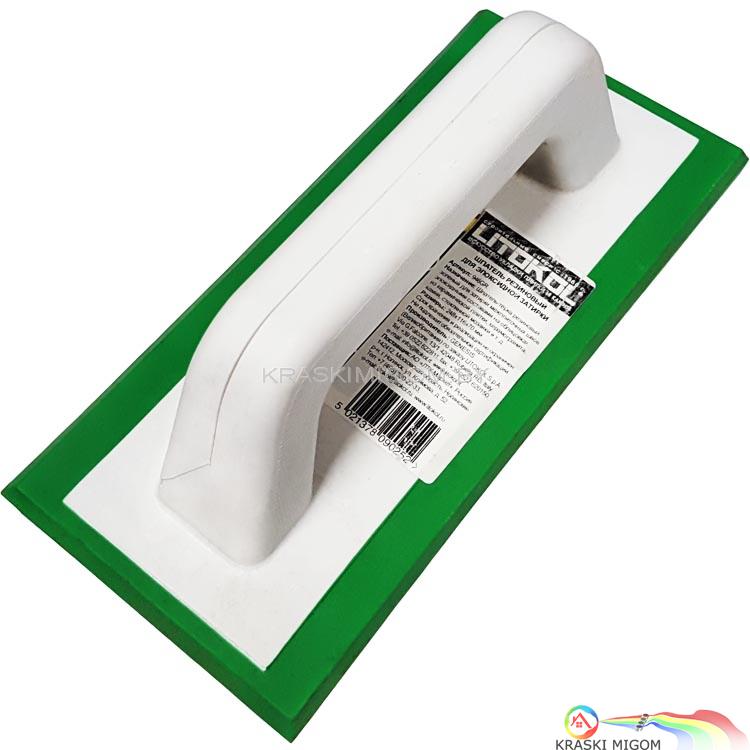 Универсальный резиновый шпатель-терка зеленого цвета с ручкой из ударопрочного пластика и платформой (подошва) из мелкопористой вулканизированной резины. Не дубеет после контакта с катализатором-отвердителем эпоксидной фуги, сохраняя эластичность. Благодаря постоянной упругости, не царапает плитку фракционным наполнителем фуги.